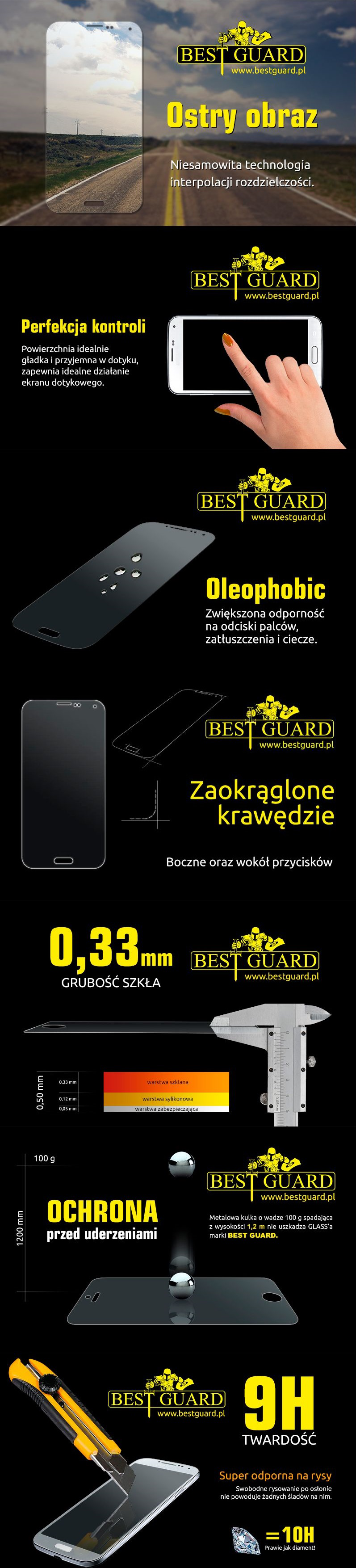 Oryginalne szkło marki BEST GUARD Wykonane z 0,3 milimetrowego japońskiego szkła hartowanego, które przy tej grubości jest bardziej twarde od hartowanej stali. Jest całkowicie odporne na zarysowania oraz uderzenia. Dodatkowo jest całkowicie przejrzyste, a raz założone doskonale komponuje się z wyświetlaczem. Posiada zaokrąglone rogi oraz zaokrąglenie przy przyciskach. Specjalna struktura zmniejsza widoczność smug na szkle.